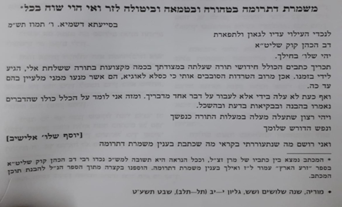 יד. ידוע גם שהגרי”ש אלישיב זיע”א שלח למרנא שליט”א מכתב הערות רחב על ספרו “זרע הארץ” שהוציא סמוך לנישואיו בעניני זרעים, ונדפסו הדברים ב”מוריה” (שבט תשע”ט), להלן תחילת המכתב המגלה את חיבת הקד”ש.